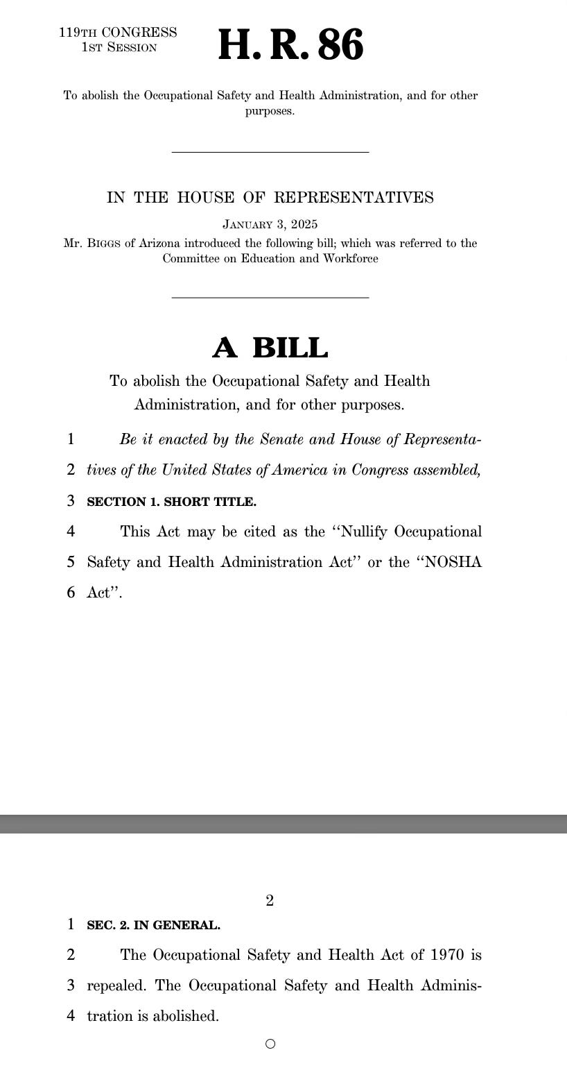 Representative Andy Biggs R AZ introduced HR 86 on, February 2nd; the bill would abolish the Occupational Safety and Health Administration (OSHA), a Department of Labor agency tasked with overseeing workplace safety. A copy of the bill is provided below.